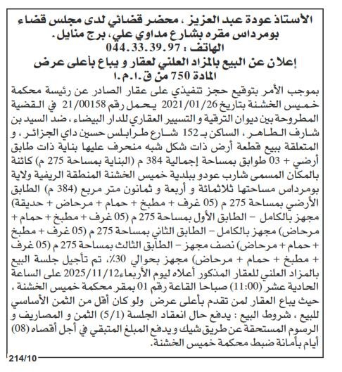 Il sera procédé à la vente au plus offrant et dernier enchérisseur le :