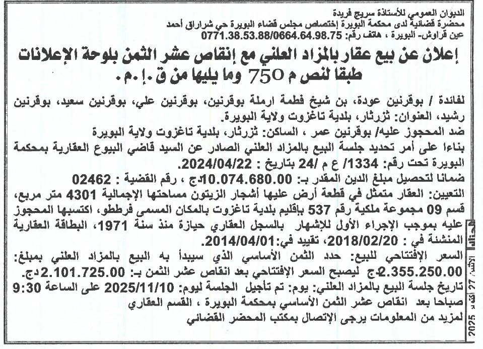 Il sera procédé à la vente au plus offrant et dernier enchérisseur le :