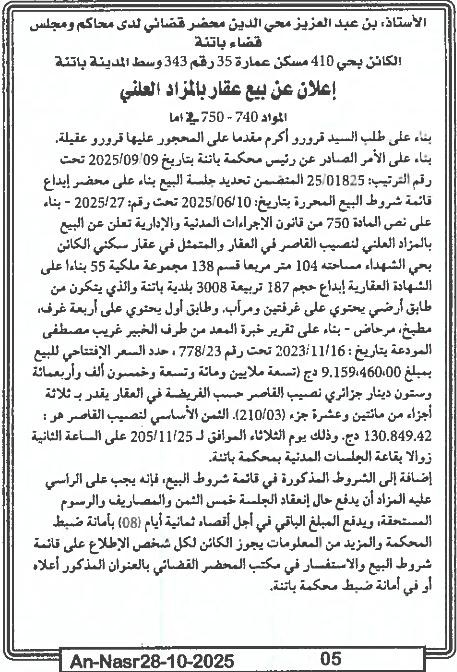 Il sera procédé à la vente au plus offrant et dernier enchérisseur le :