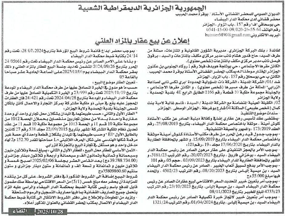 Il sera procédé à la vente au plus offrant et dernier enchérisseur le : 06/11/2025';
