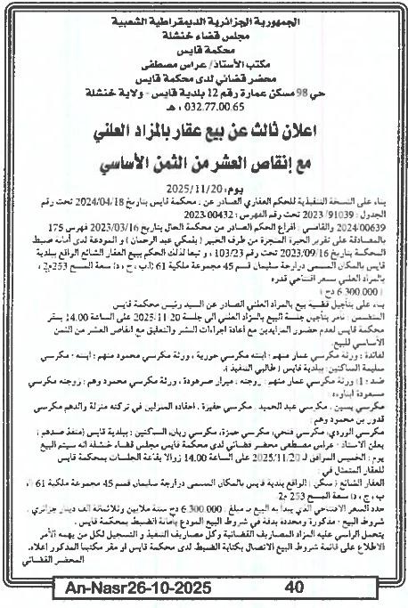 Il sera procédé à la vente au plus offrant et dernier enchérisseur le :