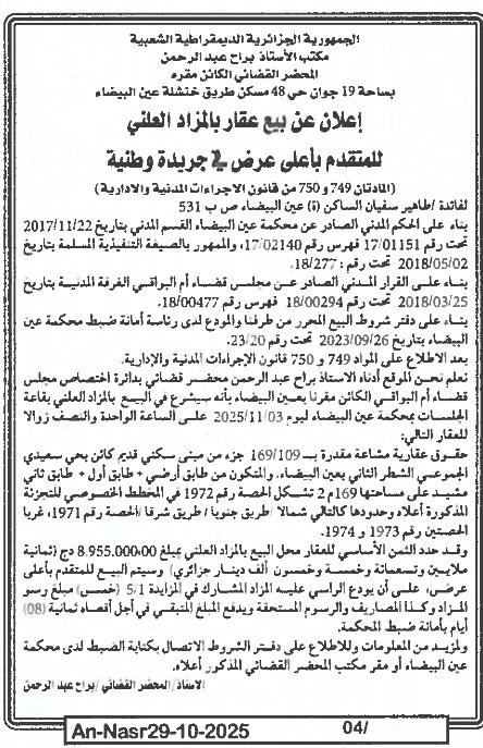Il sera procédé à la vente au plus offrant et dernier enchérisseur le :