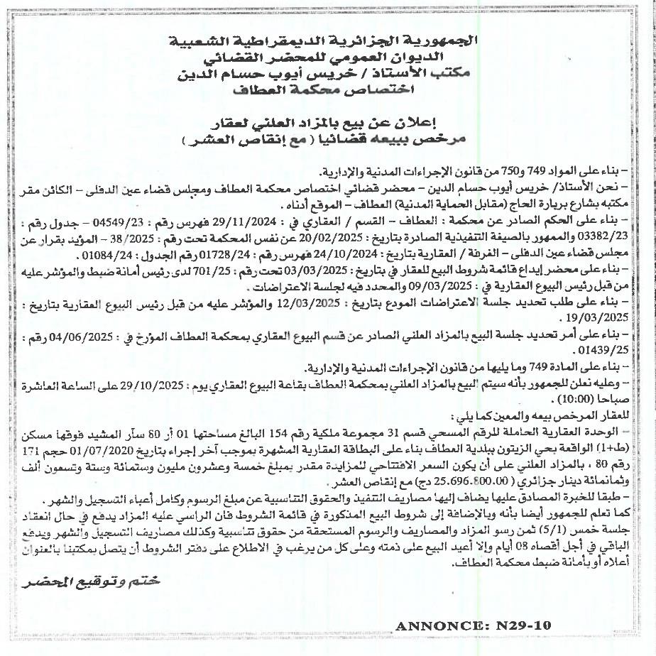 Il sera procédé à la vente au plus offrant et dernier enchérisseur le : 05/11/2025';