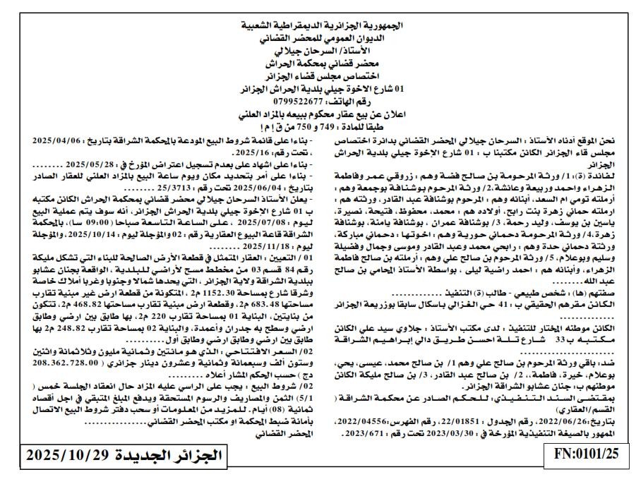 Il sera procédé à la vente au plus offrant et dernier enchérisseur le :