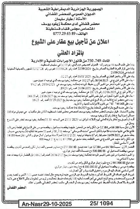 Il sera procédé à la vente au plus offrant et dernier enchérisseur le : 05/11/2025';