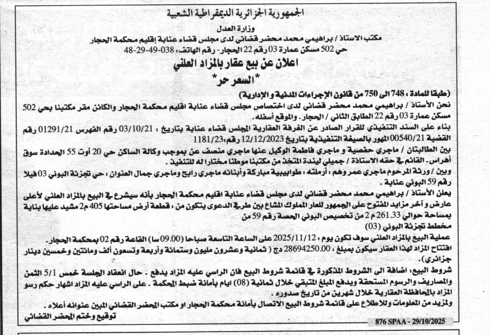 Il sera procédé à la vente au plus offrant et dernier enchérisseur le :