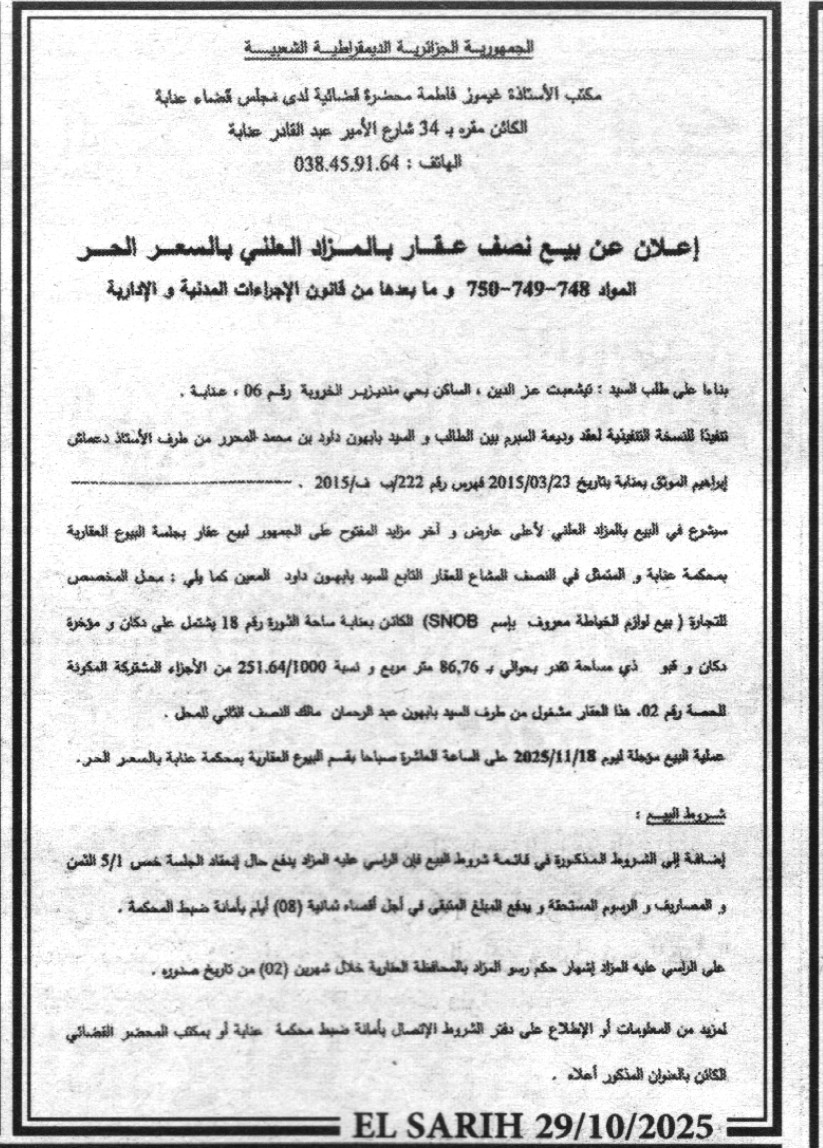 Il sera procédé à la vente au plus offrant et dernier enchérisseur le :