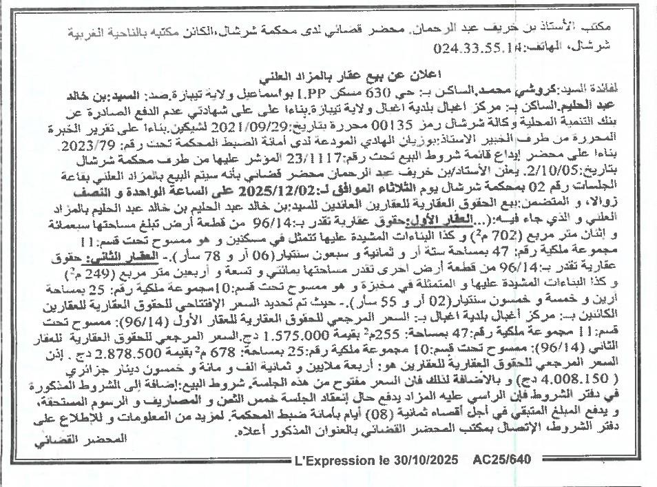 Il sera procédé à la vente au plus offrant et dernier enchérisseur le :