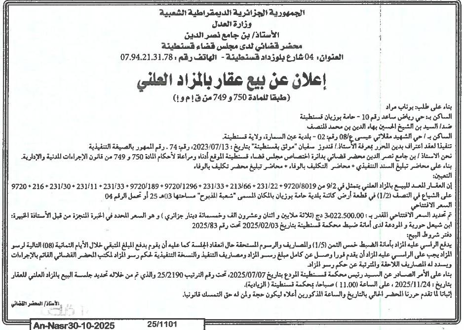 Il sera procédé à la vente au plus offrant et dernier enchérisseur le :