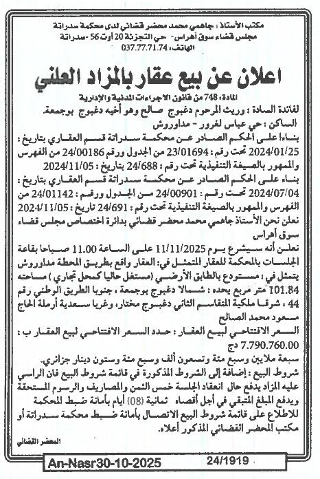 Il sera procédé à la vente au plus offrant et dernier enchérisseur le :