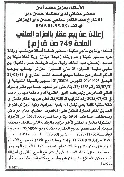 Il sera procédé à la vente au plus offrant et dernier enchérisseur le :