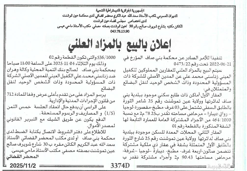 Il sera procédé à la vente au plus offrant et dernier enchérisseur le : 04/11/2025
