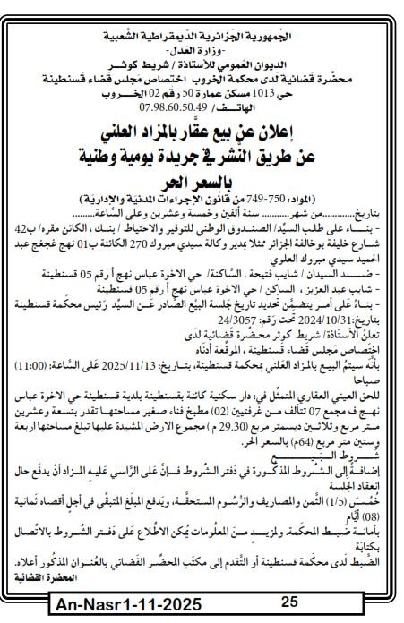 Il sera procédé à la vente au plus offrant et dernier enchérisseur le :