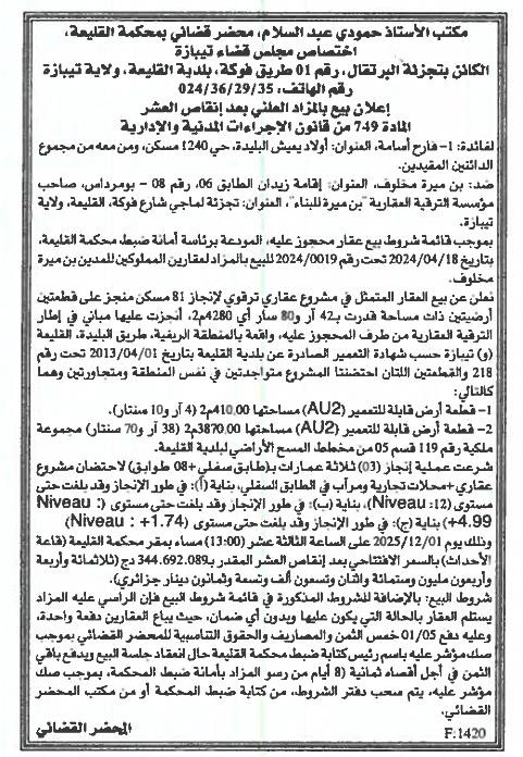 Il sera procédé à la vente au plus offrant et dernier enchérisseur le :