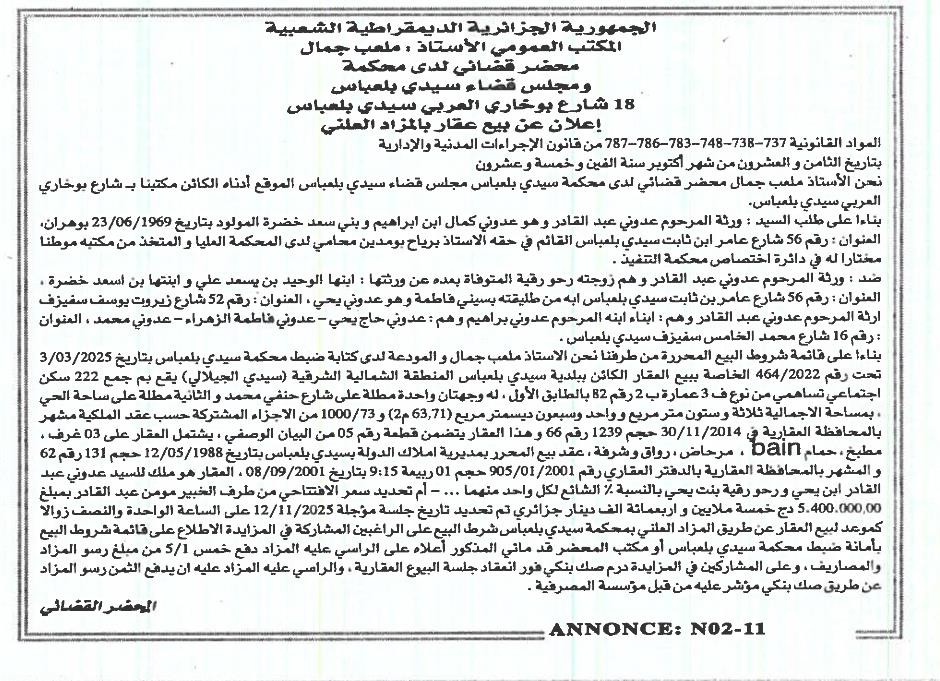 Il sera procédé à la vente au plus offrant et dernier enchérisseur le :