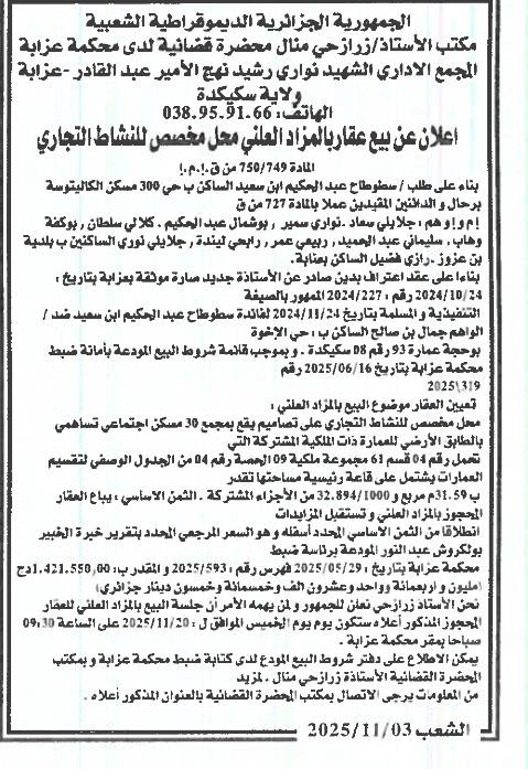 Il sera procédé à la vente au plus offrant et dernier enchérisseur le : 20/11/2025';