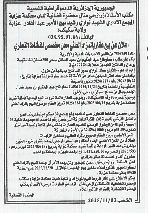 Il sera procédé à la vente au plus offrant et dernier enchérisseur le :