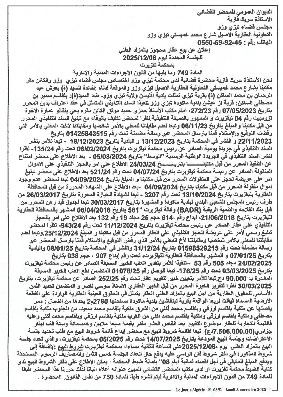 Il sera procédé à la vente au plus offrant et dernier enchérisseur le :