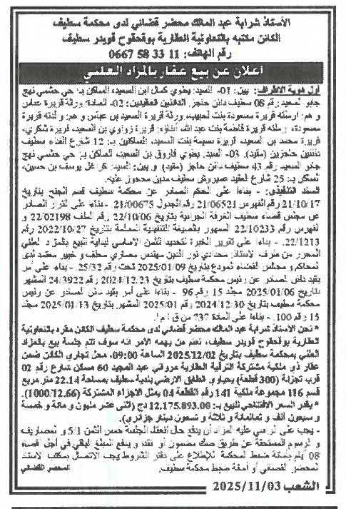 Il sera procédé à la vente au plus offrant et dernier enchérisseur le : 10/11/2025';