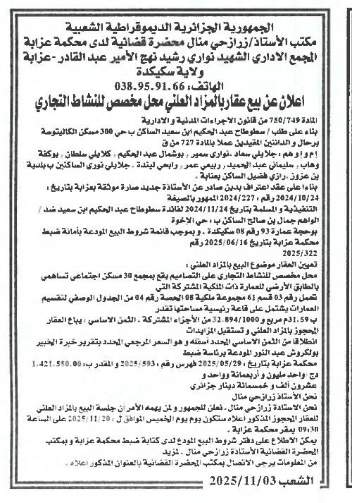 Il sera procédé à la vente au plus offrant et dernier enchérisseur le :