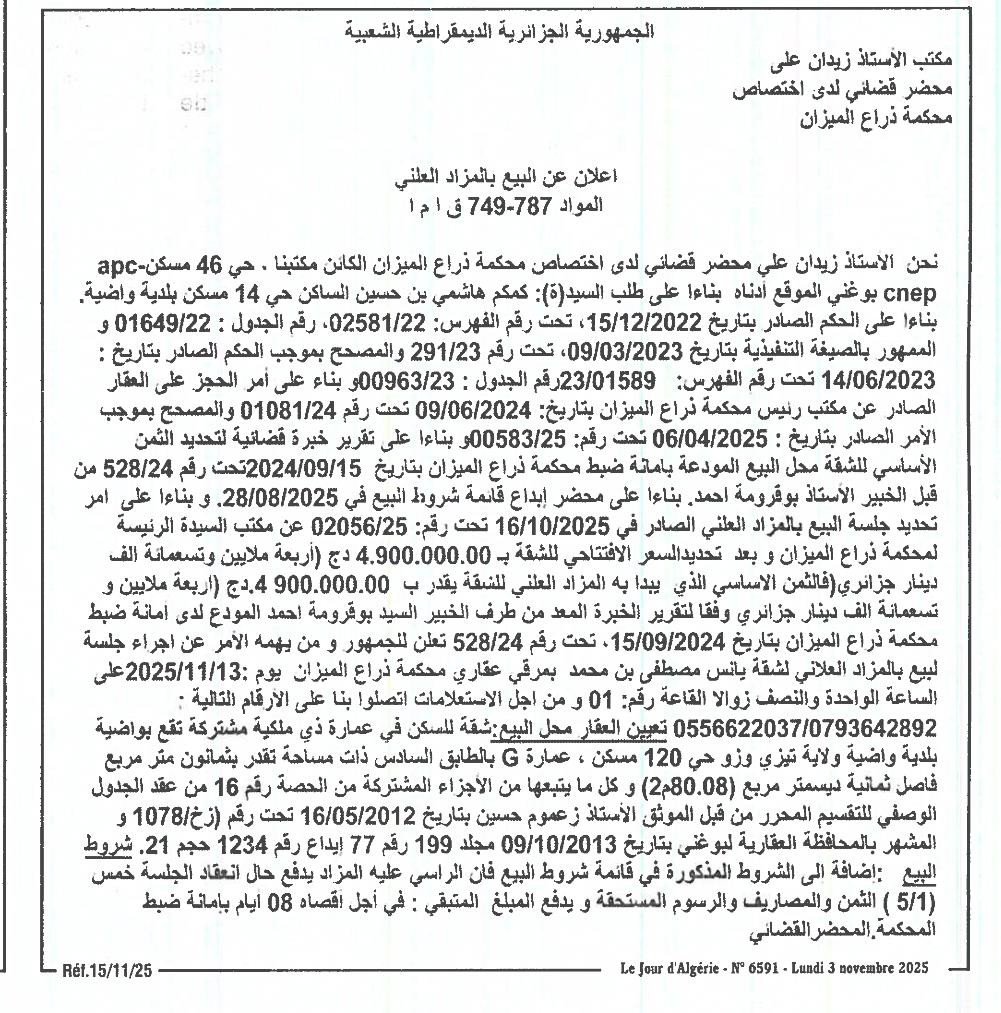 Il sera procédé à la vente au plus offrant et dernier enchérisseur le :
