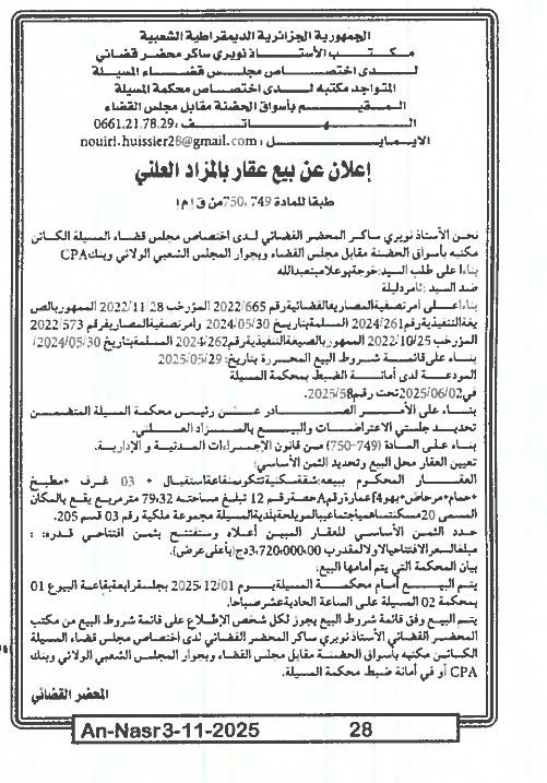 Il sera procédé à la vente au plus offrant et dernier enchérisseur le :