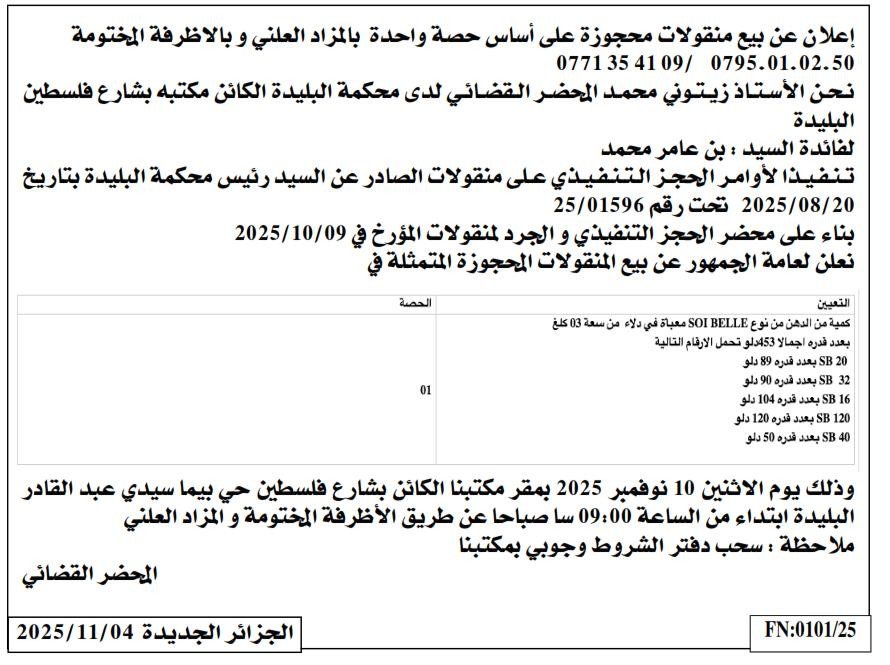 Il sera procédé à la vente au plus offrant et dernier enchérisseur le :