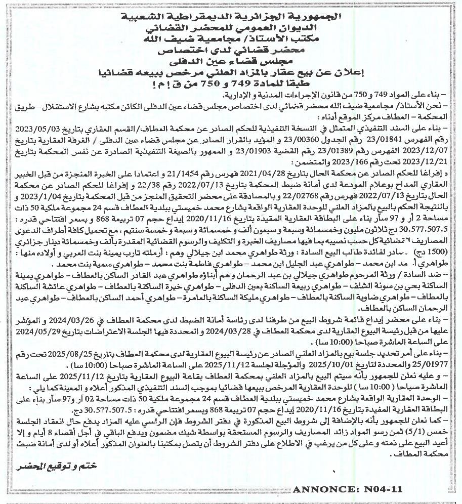 Il sera procédé à la vente au plus offrant et dernier enchérisseur le :