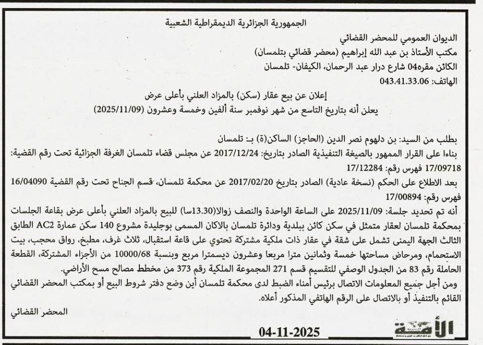 Il sera procédé à la vente au plus offrant et dernier enchérisseur le : 09/11/2025';
