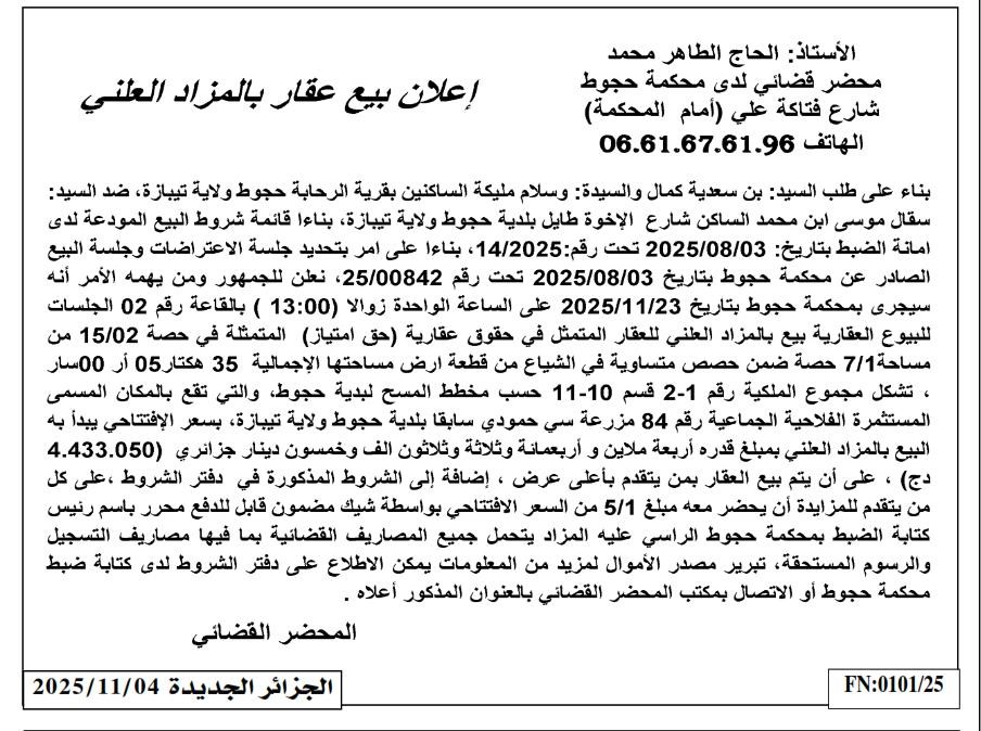 Il sera procédé à la vente au plus offrant et dernier enchérisseur le :