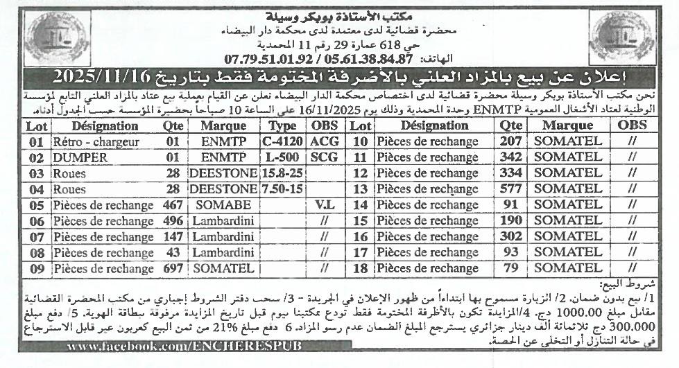 | Objet: Vente de matériel appartenant à l’Entreprise Nationale de Matériel des Travaux Publics (ENMTP). | |