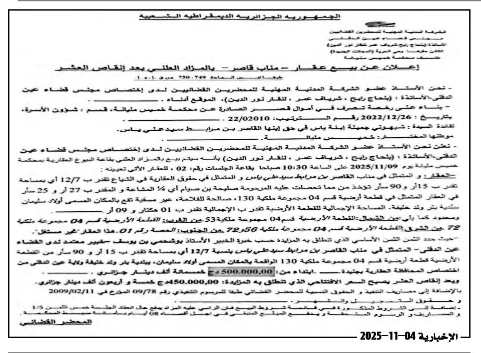 Il sera procédé à la vente au plus offrant et dernier enchérisseur le :