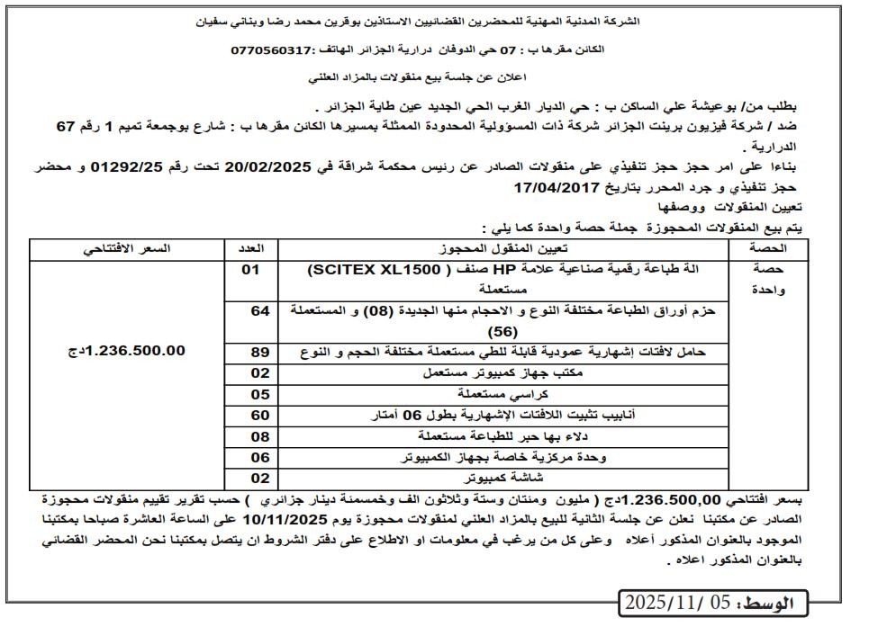 Il sera procédé à la vente au plus offrant et dernier enchérisseur le :