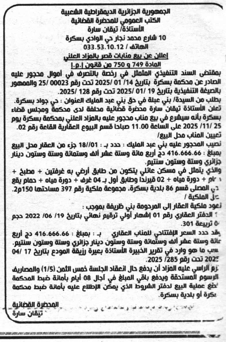 Il sera procédé à la vente au plus offrant et dernier enchérisseur le : 12/11/2025';