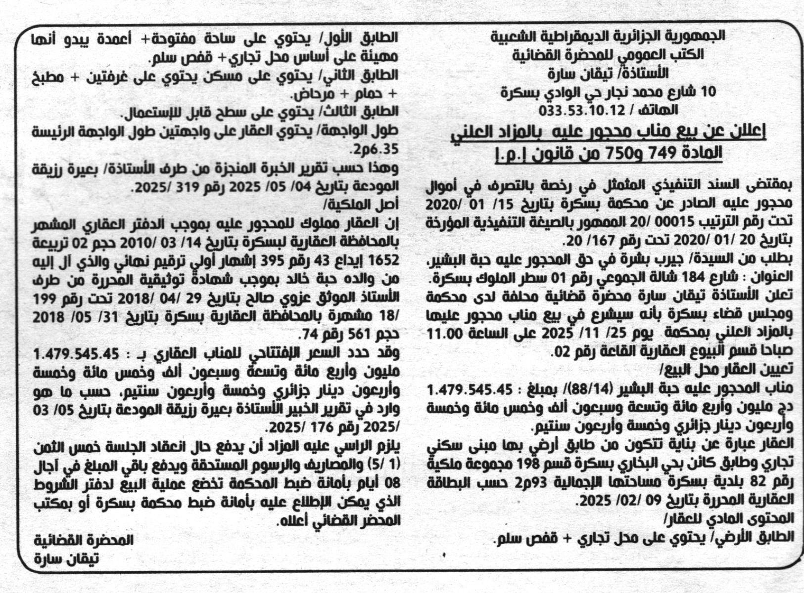 Il sera procédé à la vente au plus offrant et dernier enchérisseur le : 12/11/2025';