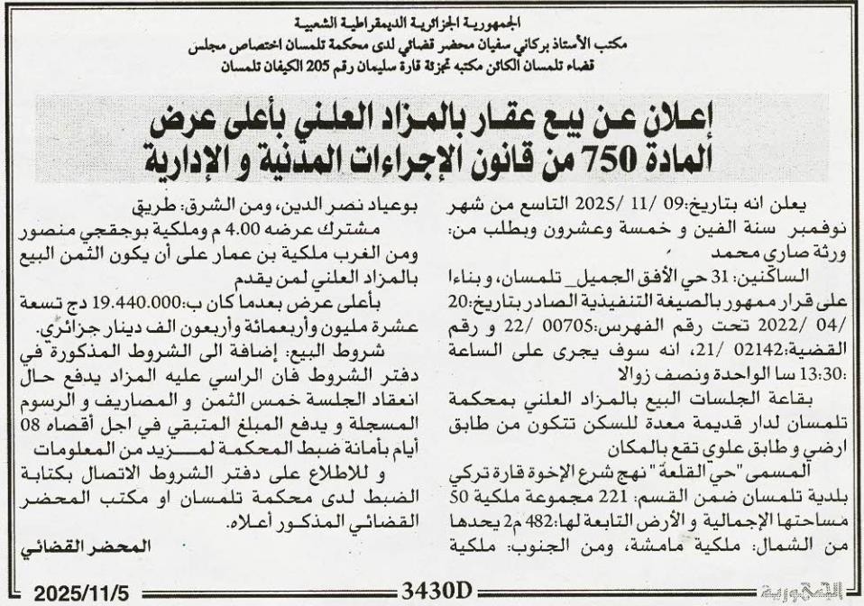Il sera procédé à la vente au plus offrant et dernier enchérisseur le :