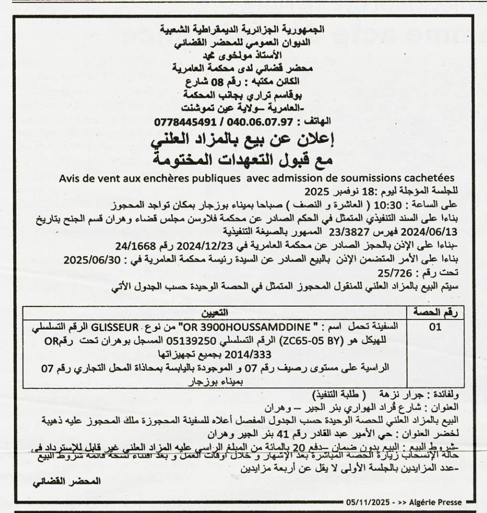 Il sera procédé à la vente au plus offrant et dernier enchérisseur le :