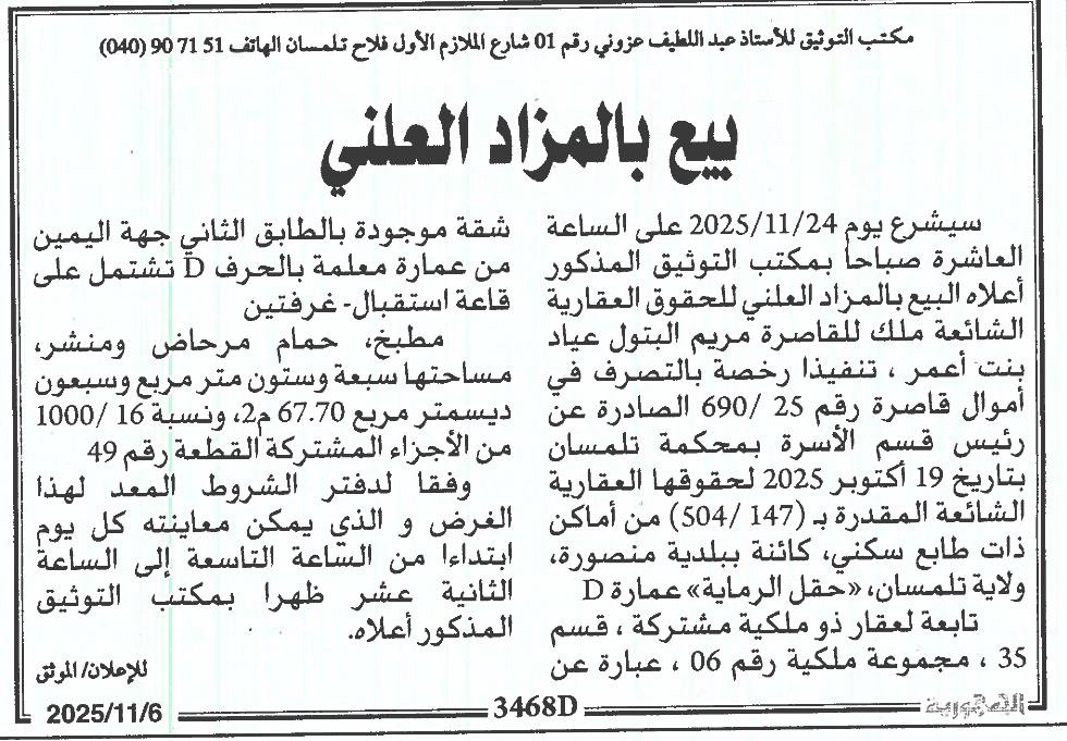 Il sera procédé à la vente au plus offrant et dernier enchérisseur le :
