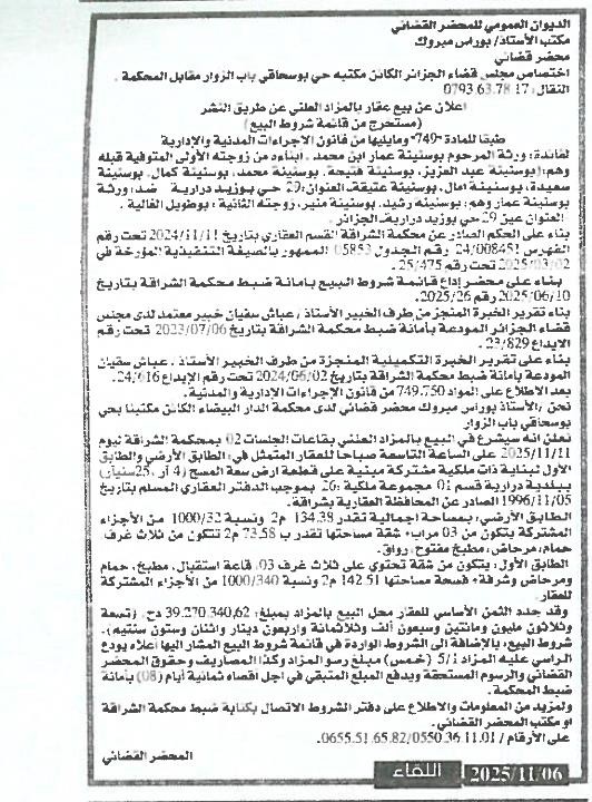 Il sera procédé à la vente au plus offrant et dernier enchérisseur le : 13/11/2025';
