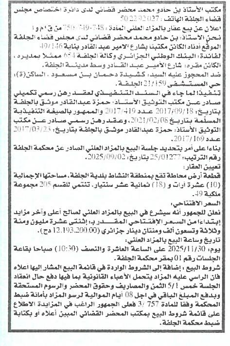 Il sera procédé à la vente au plus offrant et dernier enchérisseur le : 13/11/2025';
