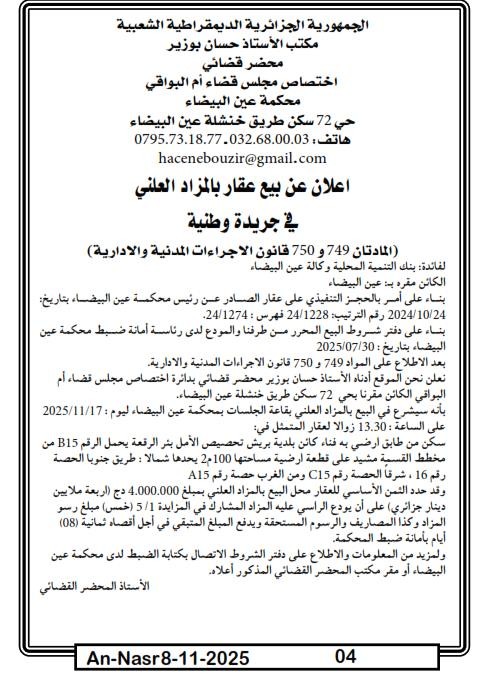 Il sera procédé à la vente au plus offrant et dernier enchérisseur le :