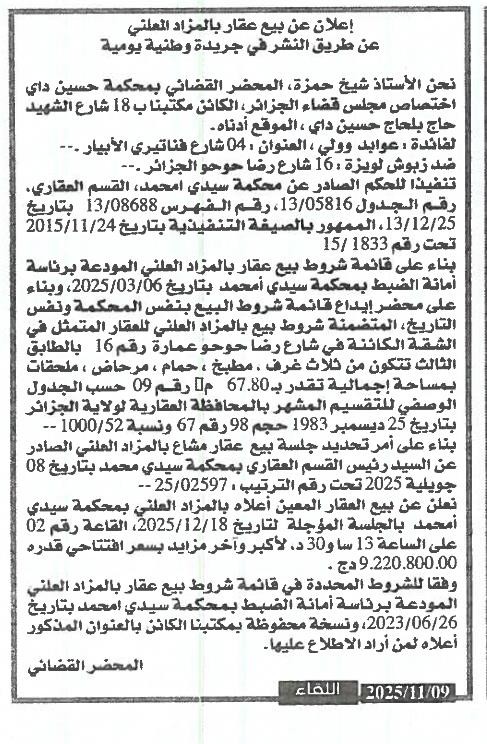 Il sera procédé à la vente au plus offrant et dernier enchérisseur le :