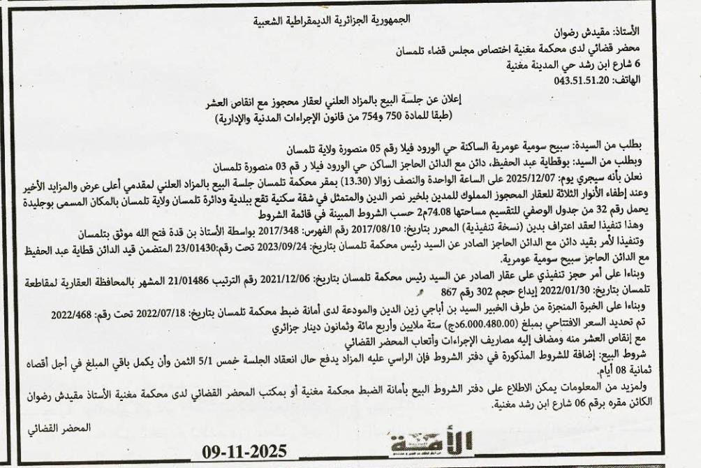 Il sera procédé à la vente au plus offrant et dernier enchérisseur le :