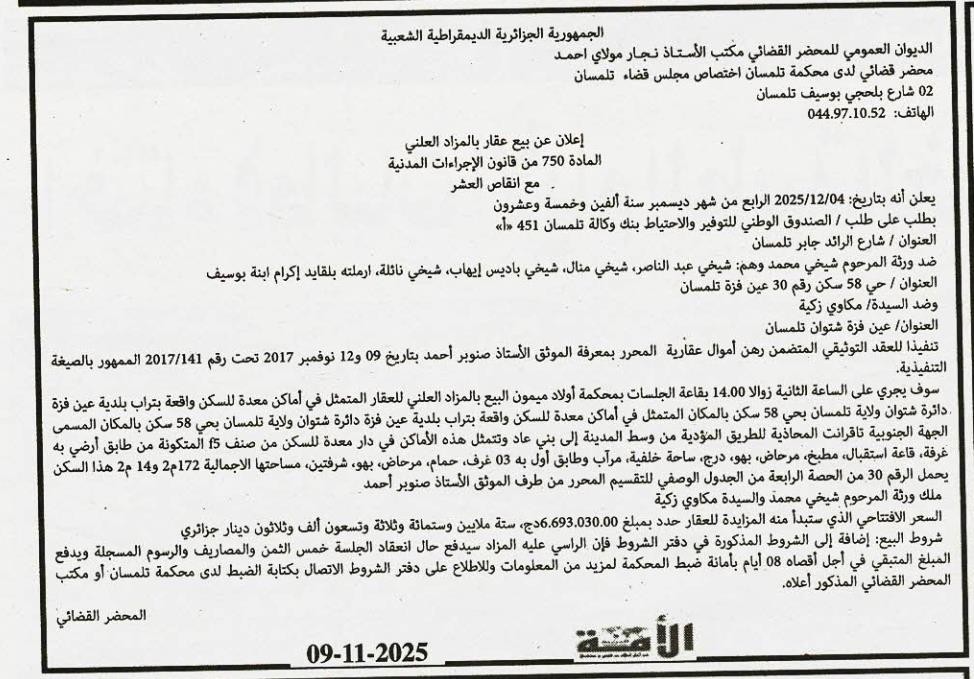 Il sera procédé à la vente au plus offrant et dernier enchérisseur le : 16/11/2025';