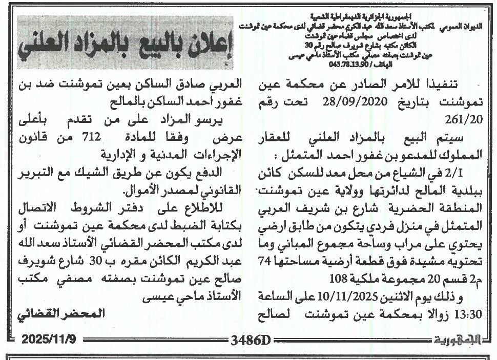 Il sera procédé à la vente au plus offrant et dernier enchérisseur le : 10/11/2025
