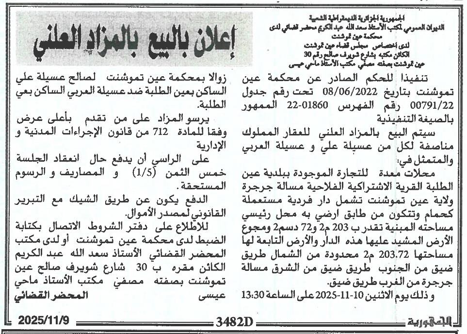 Il sera procédé à la vente au plus offrant et dernier enchérisseur le : 10/11/2025';
