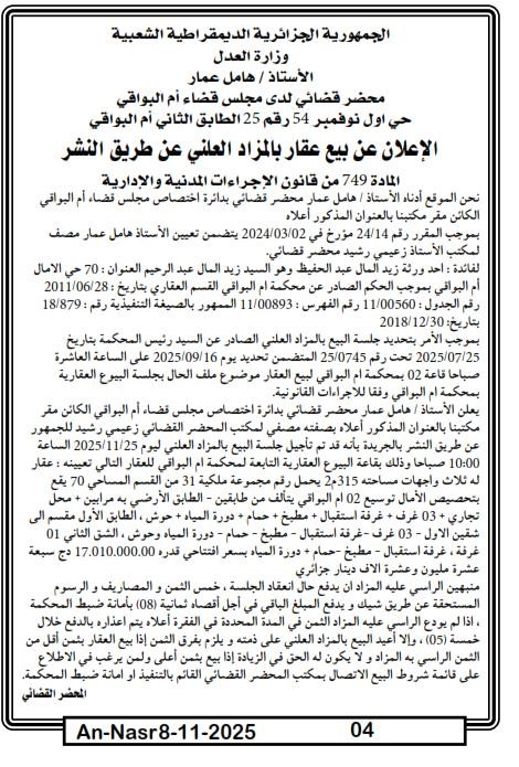 Il sera procédé à la vente au plus offrant et dernier enchérisseur le :