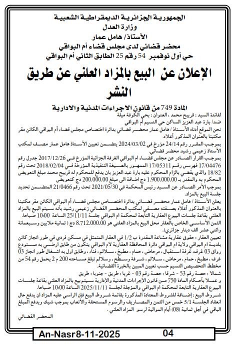 Il sera procédé à la vente au plus offrant et dernier enchérisseur le :