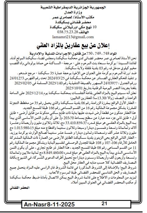 Il sera procédé à la vente au plus offrant et dernier enchérisseur le :