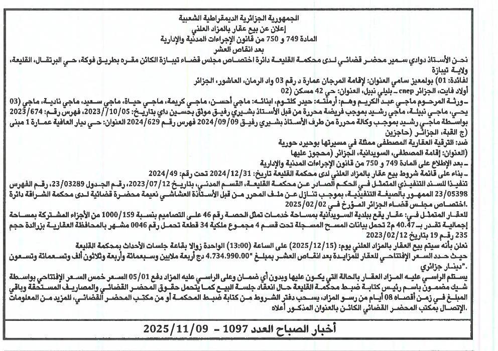 Il sera procédé à la vente au plus offrant et dernier enchérisseur le :